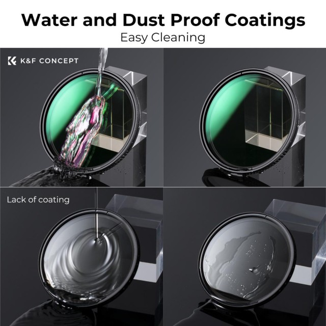 El filtro variable K&F Concept ND2-ND32 está diseñado para técnicas de exposición prolongada y desenfoque de movimiento en condiciones de luz variable. Reduce la entrada de luz entre 1 y 5 pasos sin afectar al equilibrio de colores, siendo adecuado para condiciones de luz solar moderada o de intensidad media. Su filtro variable ND2-ND32 de la serie K&F Concept Nano-Dazzle está fabricado con cristal óptico HD AGC; un total de 24 capas multicapa ayudan a repeler el agua y el polvo, y reducen eficazmente el reflejo del propio filtro y los destellos. La superficie de la lente está oxidada y pulida con arena para evitar eficazmente la penetración de la luz difusa y reducir el reflejo de la superficie metálica.