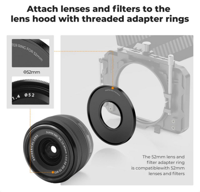 El anillo adaptador K&F 52 mm para matte box está fabricado en aleación de aluminio de calidad aeronáutica, lo que le confiere resistencia y, al mismo tiempo, una estructura ligera que reduce el peso total. El preciso mecanizado CNC garantiza una fijación perfecta del objetivo y del matte box, lo que evita eficazmente las fugas de luz y mejora la calidad de las tomas al mantener un control preciso de la iluminación.