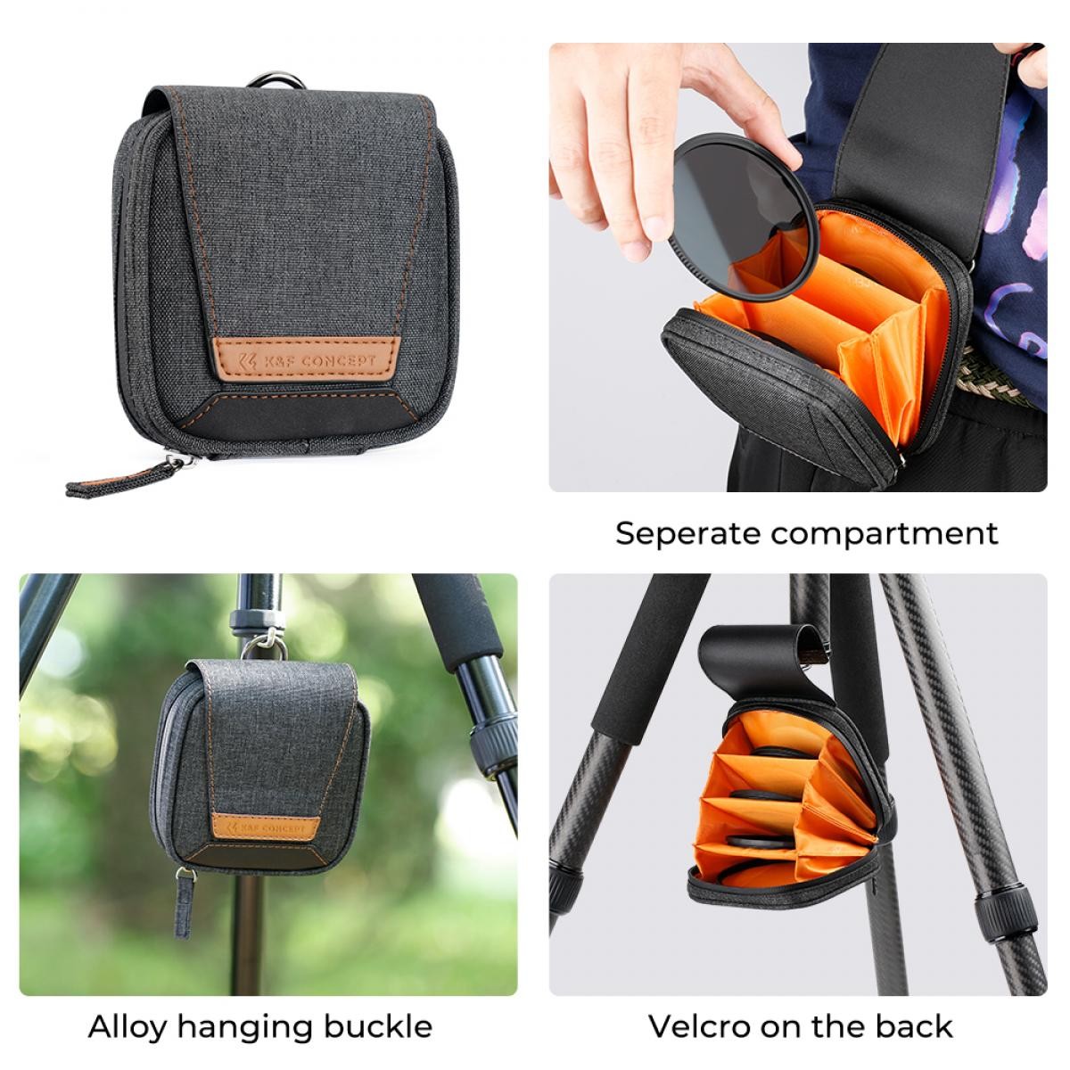Con el estuche para filtros se pueden transportar 4 filtros, cada uno en un compartimento; el estuche cuenta con velcro y gancho, lo que permite transportarlos de varias formas.