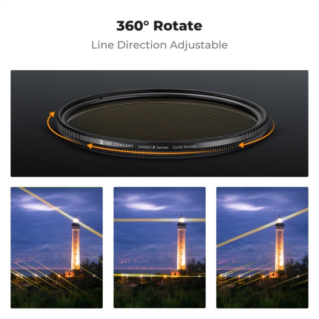 Al colocar el filtro K&F Concept Streak Gold delante del objetivo, puedes crear el mismo reflejo que con un objetivo anamórfico. Ya sea en fotografía o en vídeo, este filtro añadirá a tus imágenes un reflejo lineal que creará impresionantes efectos visuales y resaltará el toque artístico.