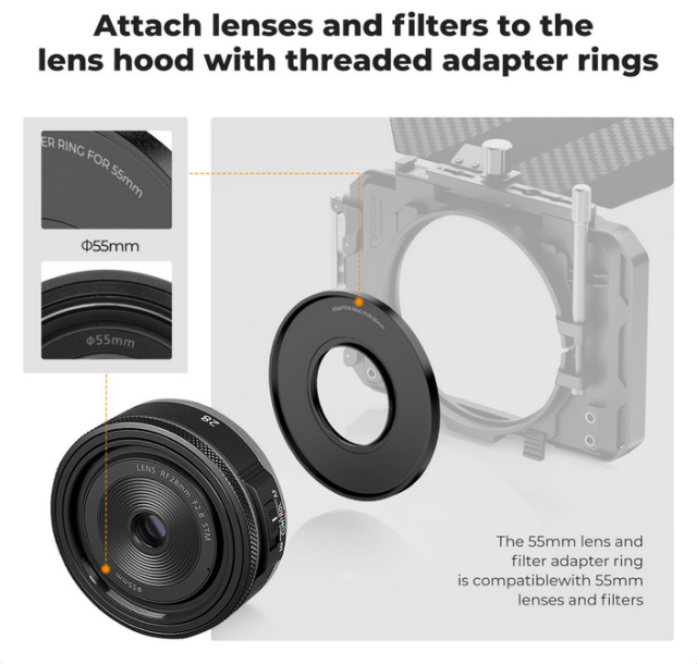 La construcción robusta de este adaptador garantiza un soporte estable del matte box incluso durante sesiones fotográficas exigentes con vibraciones o golpes, lo que asegura un rendimiento fiable y la seguridad. El diseño atornillado permite una instalación o desmontaje rápido y sin problemas, lo que agiliza su flujo de trabajo.