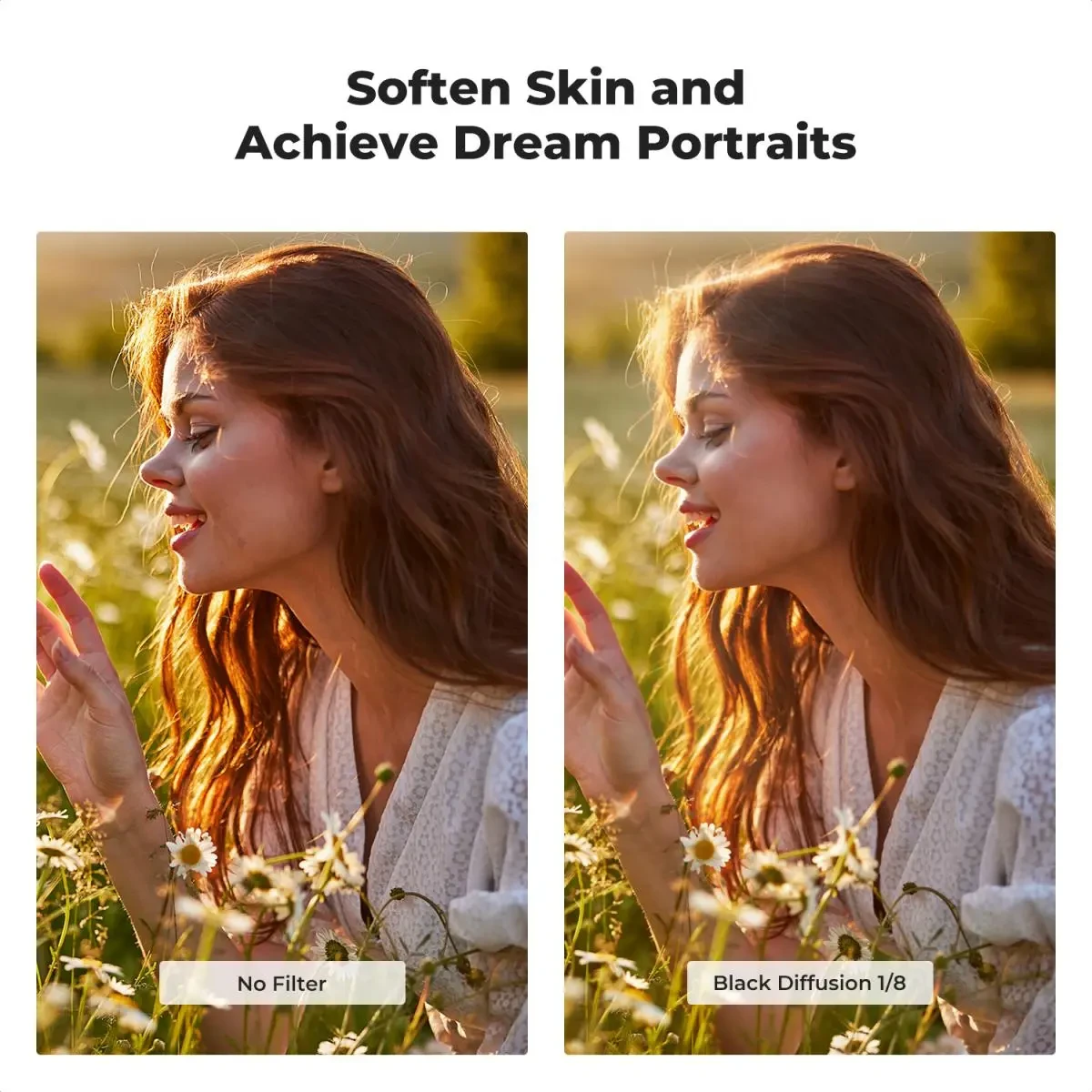 El filtro difusor negro K&F Concept 1/8 suaviza la luz en las fotografías y los vídeos y reduce los reflejos, lo que hace que la piel y los poros se vean más suaves. La tecnología de pulido a doble cara garantiza una alta resolución en distancias focales de hasta 550 mm. El filtro difusor negro 1/8 está fabricado con cristal óptico de alta precisión de la empresa japonesa AGC y cuenta con un tratamiento superficial multicapa para una transparencia extra con una transmitancia del 87 %, lo que reduce eficazmente los reflejos del propio filtro.