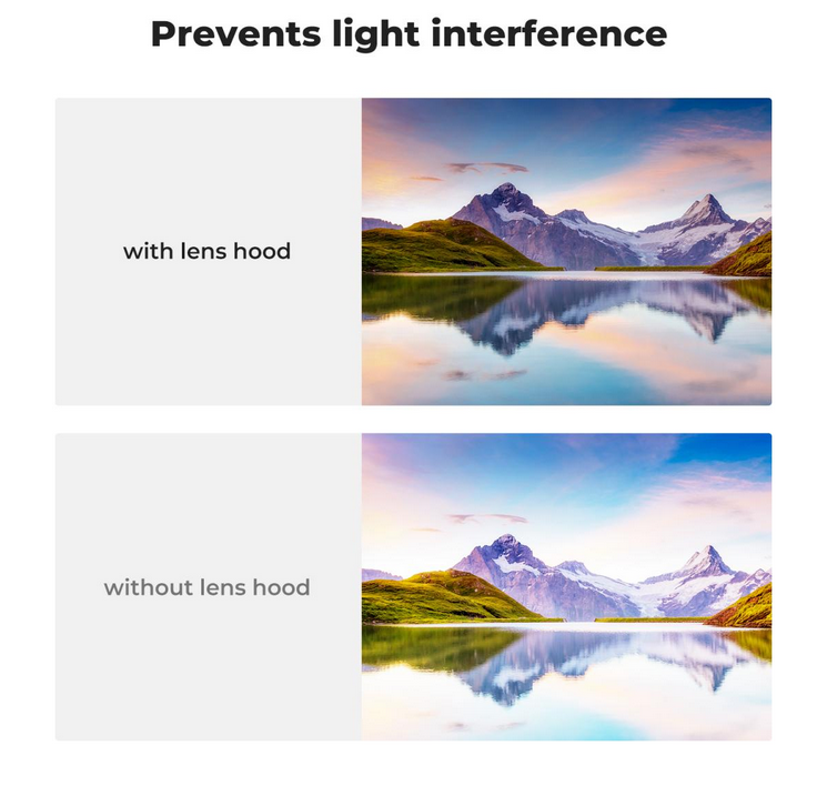 • Prevención eficaz de las interferencias lumínicas: mejora la calidad de la imagen bloqueando la luz no deseada al fotografiar a contraluz, con luz lateral o con flash.