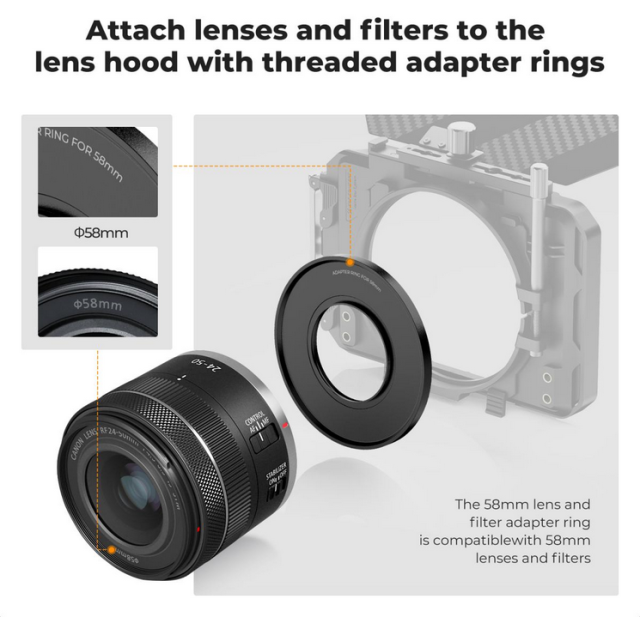 Mejora tu equipo de filmación con el anillo adaptador K&F 58 mm Matte Box Ring, diseñado específicamente para funcionar a la perfección con los matte boxes de K&F Concept. Este anillo adaptador está fabricado en aleación de aluminio de calidad aeronáutica y ofrece una resistencia excepcional sin renunciar a su ligereza, lo que permite minimizar el peso total del equipo.