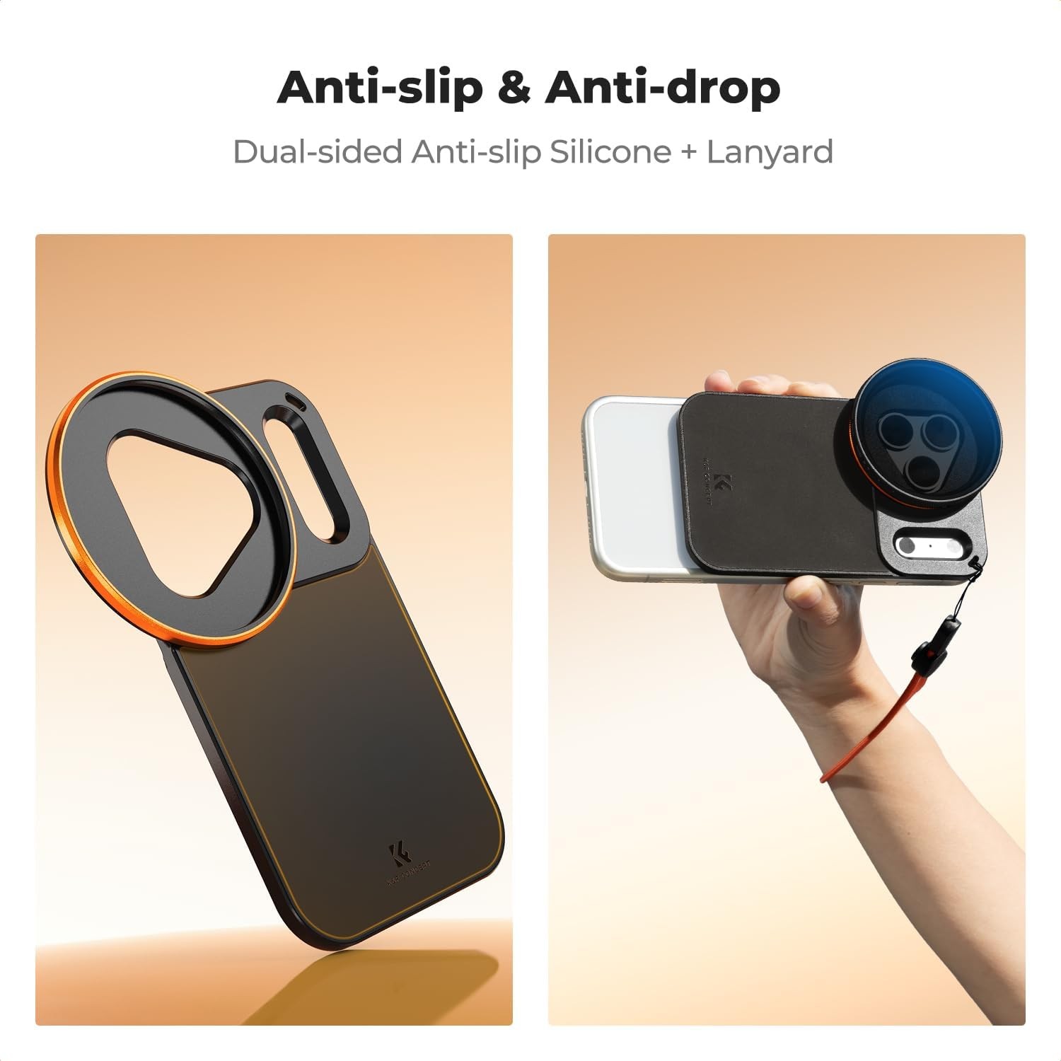 El soporte magnético de doble cara atornillable K&F de 58 mm para el iPhone 17 Pro Max ofrece una fijación precisa, potentes imanes de doble cara y es compatible con filtros de 58 mm de diámetro, incluido el filtro VND incluido. Garantiza una fotografía móvil estable, segura y versátil con una protección completa y un almacenamiento portátil.
