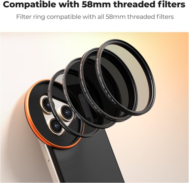 El filtro roscado universal de 58 mm es compatible con todos los principales tipos de filtros, incluidos los ND, CPL, UV, estelares y especiales. Gracias a sus cuatro anillos roscados de corte preciso, garantiza un ajuste firme de los filtros sin que se aflojen ni obstaculicen el objetivo de la cámara. Diseñado para ofrecer el mejor rendimiento en un iPhone sin funda, también es compatible con fundas oficiales de Apple o de terceros si se utiliza con el anillo magnético incluido.