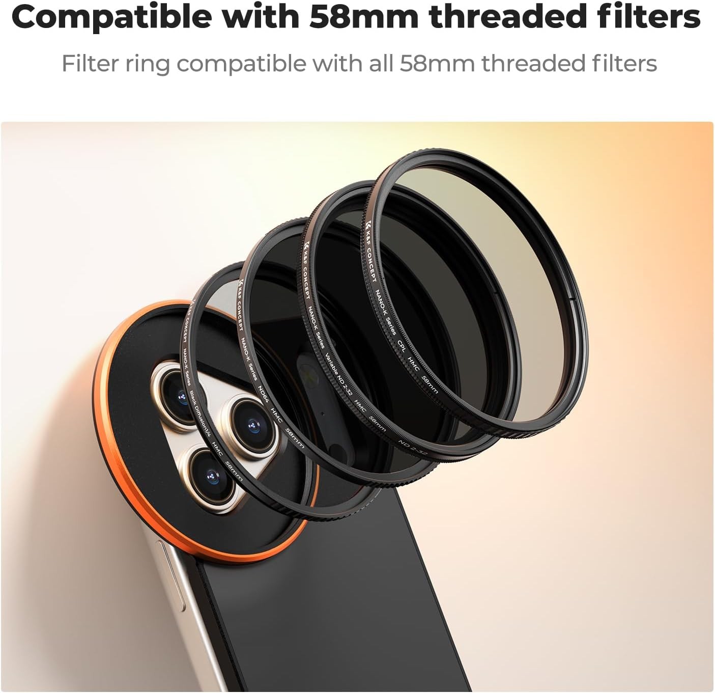 El soporte magnético de doble cara con rosca de 58 mm de K&F Concept para el iPhone 17 Pro Max es un soporte metálico de fabricación precisa que permite utilizar de forma segura filtros profesionales de 58 mm con rosca para cámaras. Gracias a los imanes de neodimio N52 ultrapotentes, su estructura de aluminio aeronáutico y su total compatibilidad con objetivos, flashes y señales, ofrece una solución estable, protectora y ampliable para la fotografía móvil.