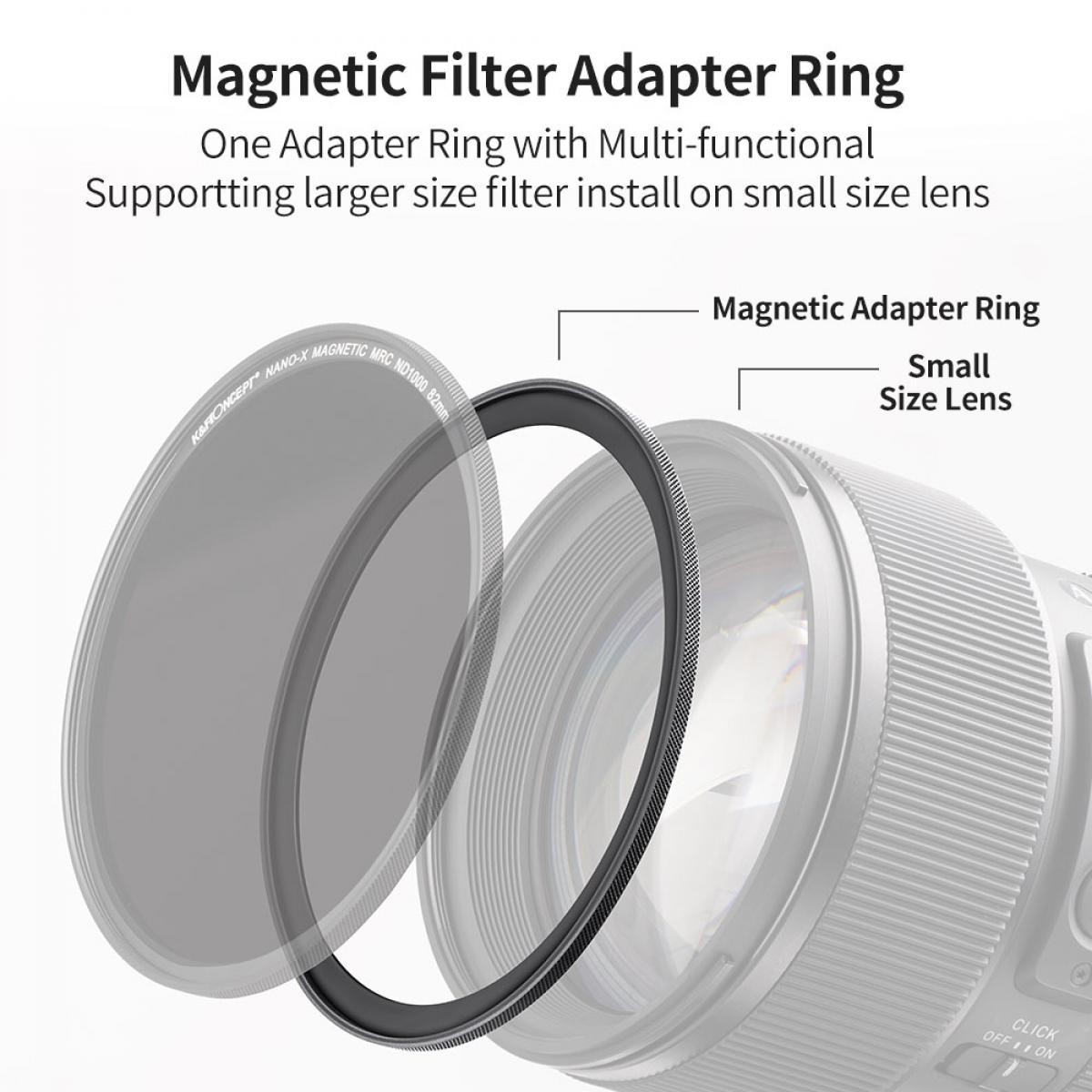 Anillo magnético adaptador para filtros de objetivo K&F de 62-77 mm. Los filtros más grandes se pueden adaptar a objetivos con roscas de menor tamaño.