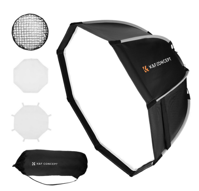 El softbox octogonal de montaje rápido K&F de 65 cm es el accesorio ideal para fotógrafos y videógrafos que desean lograr excelentes resultados de iluminación. Este softbox de 26 pulgadas (65 cm) es la solución perfecta para mejorar retratos, bodas, fotografía de moda, grabaciones de vídeo, retransmisiones en directo y entrevistas.