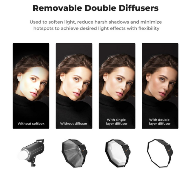 - Rejilla de panal y difusores: La rejilla de panal concentra y controla la dirección de la luz, lo que enriquece los niveles de luz y oscuridad en las imágenes y crea efectos de iluminación dramáticos y llamativos. Los dos difusores de alta calidad se pueden utilizar juntos o por separado para crear diferentes estilos de iluminación.