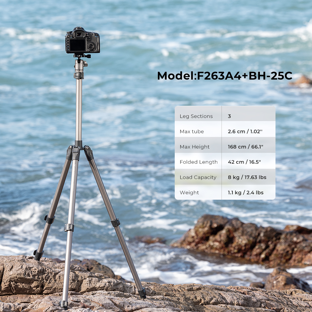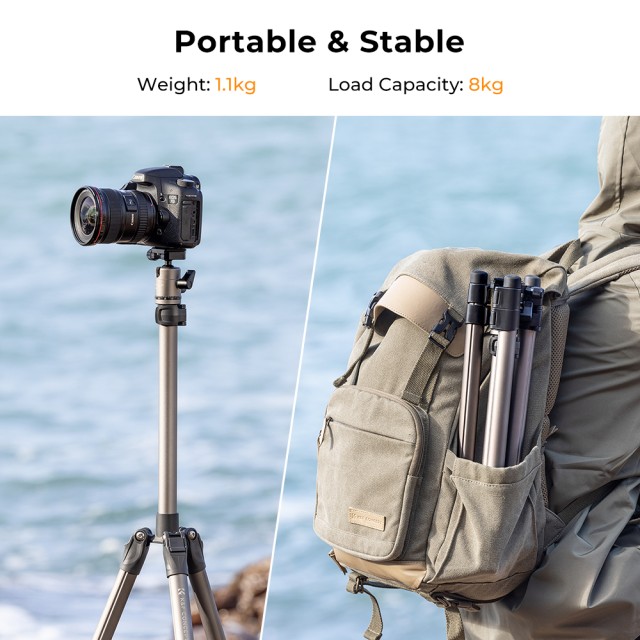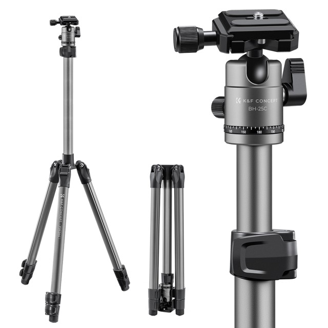 Disfruta de una flexibilidad única con nuestro trípode K&F Concept, con patas de tres secciones que permiten ajustar rápidamente la altura de trabajo entre 79 cm y 168 cm, lo que cubre el 90 % de las necesidades fotográficas en cuanto a altura. Su longitud compacta de 42 cm/16,5'' cuando está plegado garantiza un transporte sin complicaciones. El trípode cuenta con una rótula metálica panorámica de 360° fabricada con CNC, que ofrece una capacidad de carga segura de 8 kg/17,6 kg para realizar fotografías panorámicas sin problemas. El sistema de bloqueo rápido de las patas abatibles permite un manejo sencillo con una sola mano, lo que ahorra tiempo y permite concentrarse en el arte de la fotografía. Con un peso de tan solo 1,1 kg/2,42 kg, este trípode cambia las reglas del juego para la fotografía de naturaleza en los viajes. Disfruta de una compatibilidad ampliada con la rosca estándar de 1/4", lo que lo hace adecuado para la mayoría de placas de fijación rápida Arca-Swiss, cámaras, cámaras réflex digitales, proyectores, telescopios e incluso teléfonos móviles para selfies, retransmisiones en directo y time-lapse con el clip para móvil. Mejora tus fotografías con el compañero de viaje perfecto.