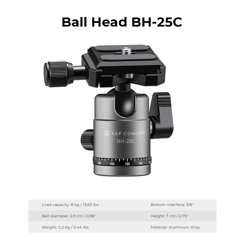 • * 【Rótula metálica panorámica de 360° con mecanizado CNC】 La rótula metálica de 25 mm exclusiva de K&F Concept ofrece una capacidad de carga segura de 8 kg/17,6 libras; su diseño de amortiguación sin aceite permite satisfacer las necesidades de una fotografía panorámica de 360° extremadamente fluida; anodizado mediante proceso CNC para una mayor resistencia al desgaste y a la corrosión.