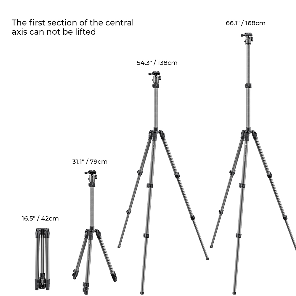 • * 【Fácil de ajustar - súper flexible】Las tres secciones de las patas permiten ajustar la altura de trabajo del trípode de 79 cm/31,1'' a 168 cm/66,1'' en cuestión de segundos, lo que cubre aproximadamente el 90 % de las necesidades de altura fotográfica; la longitud plegada es de solo 42 cm/16,5'', lo que resuelve en gran medida el problema del transporte y te permite viajar sin preocupaciones.