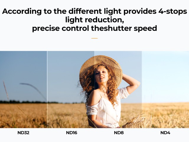 2. El filtro de densidad neutra ND4-ND32 permite una reducción de la luz ajustable en cuatro niveles. La intensidad del filtro de densidad neutra se puede ajustar en cualquier momento según sea necesario, adaptándose así a diferentes entornos de iluminación.