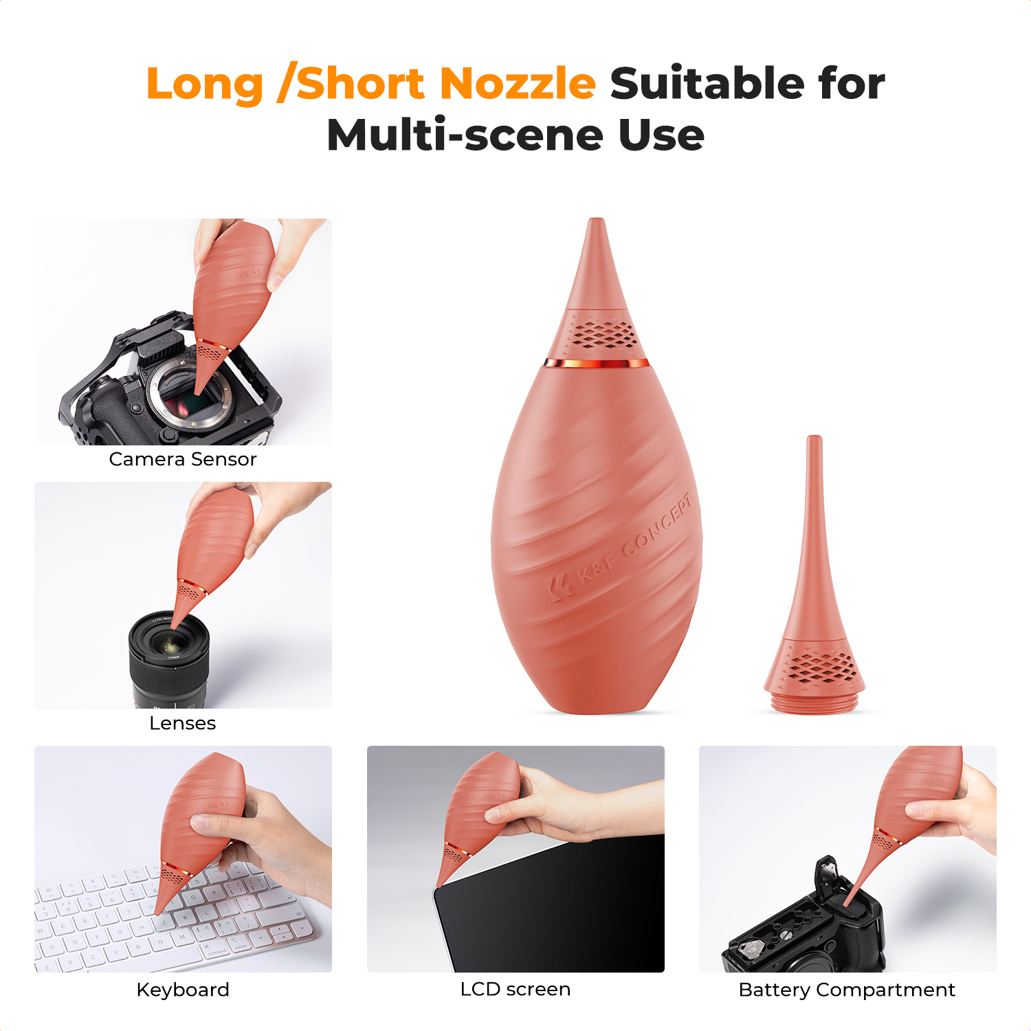 El K&F Advanced Silicone Air Blower es un versátil y elegante dispositivo de limpieza diseñado para fotógrafos y aficionados a los gadgets. Su innovador sistema de dos boquillas garantiza un flujo de aire preciso y elimina eficazmente el polvo de dispositivos delicados, como objetivos de cámaras, sensores, teclados y otros.