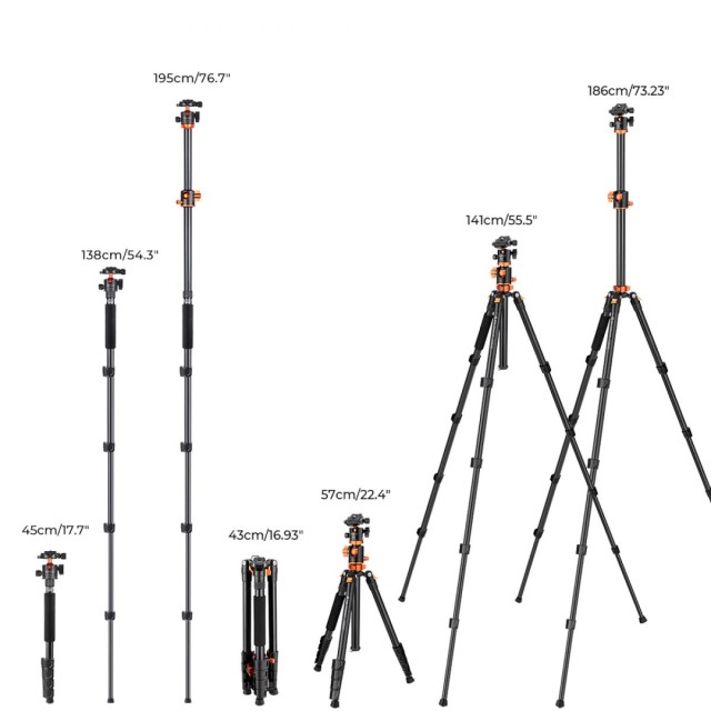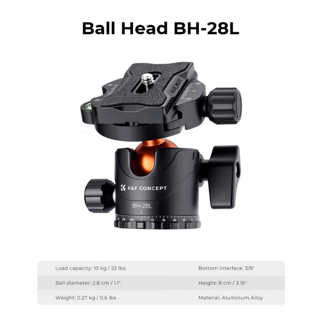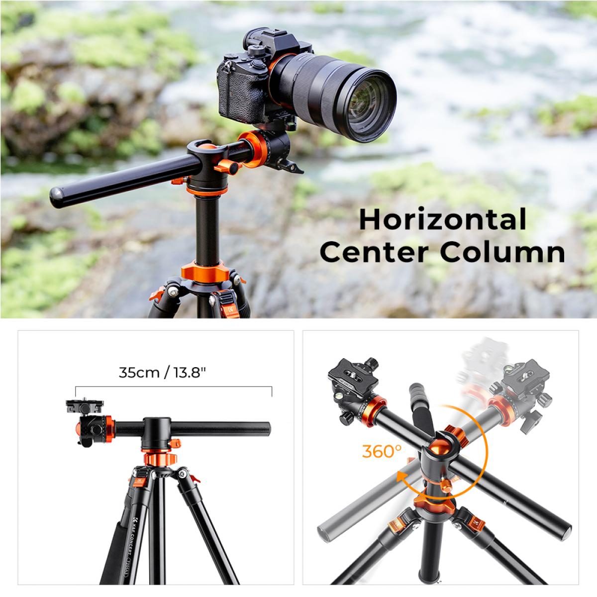 El K&F T255A3+BH-28L es un trípode de aluminio versátil para cámaras, con una columna central transversal giratoria de 360°, un monopié desmontable y una rótula de 28 mm, ideal para fotografía panorámica, macro y de viajes.