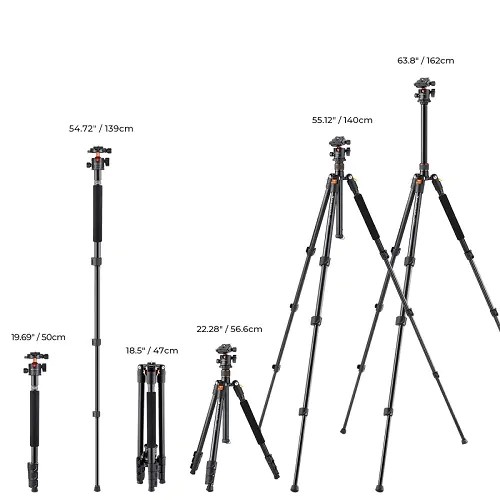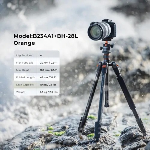 El K&F Concept B234A1+BH-28L es un trípode telescópicorobusto pero portátil, fabricado en aleación militar de magnesio y aluminio, diseñado para fotógrafos que buscan resistencia, estabilidad y flexibilidad. Gracias a su rótula de 28 mm de gran capacidad de carga y a su monopié desmontable, es ideal para fotografía de viajes, al aire libre, macro y de retratos.