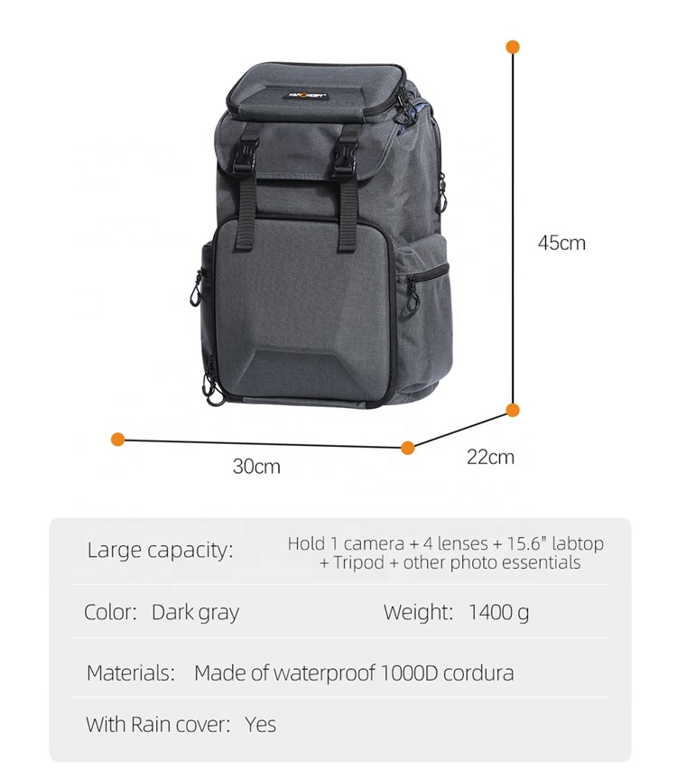 Como bolsa profesional para cámara de exterior, tiene una capacidad de 25 l, compartimentos superior e inferior, espacio para una cámara con varios objetivos y apertura frontal. Tiene capacidad para 1 cámara + 4 objetivos + una tableta de 15,6" + un trípode + otros accesorios fotográficos.