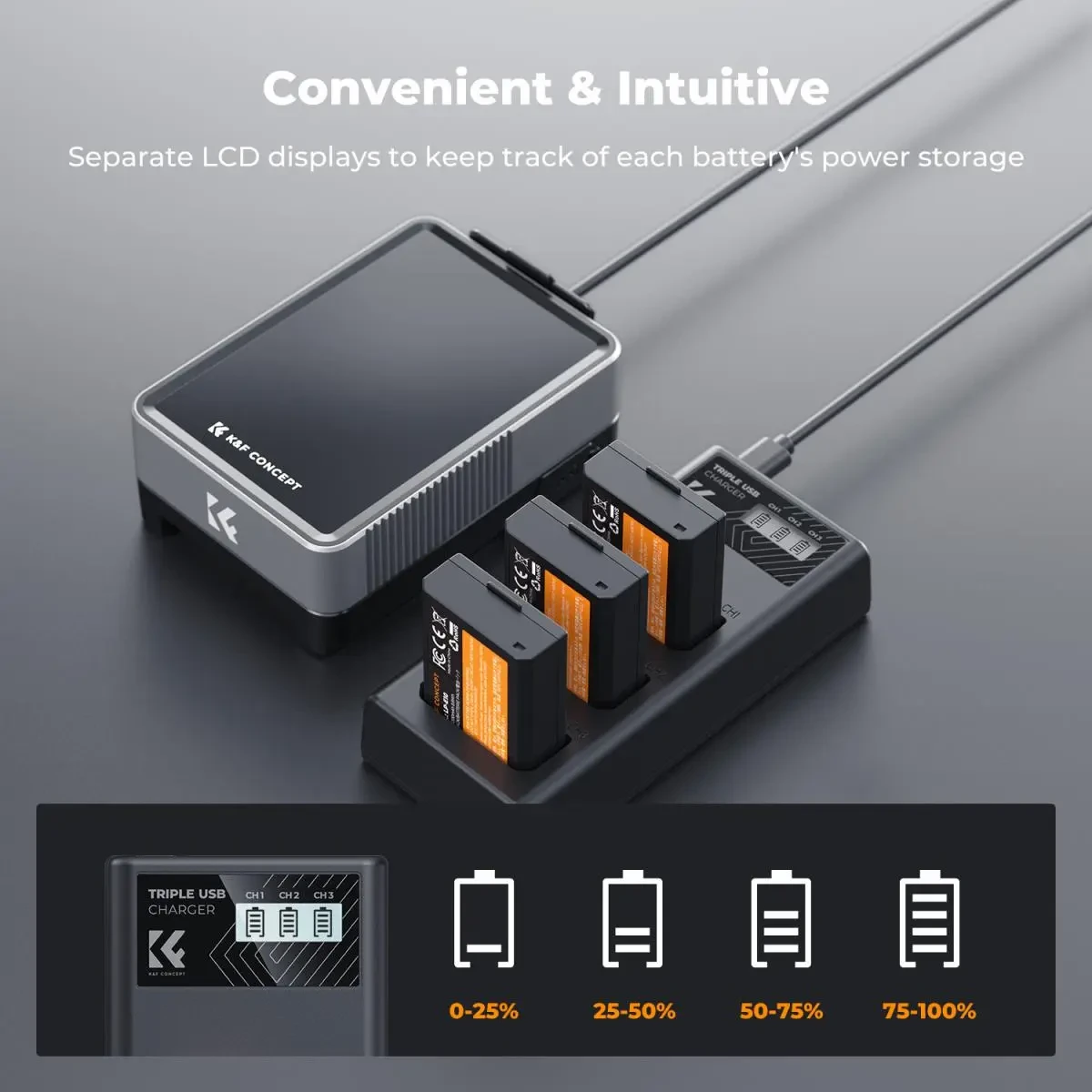 Baterías K&F Concept LP-E10, paquete de 3 unidades y cargador LCD mejorado. El cargador, con tres ranuras, puede cargar eficazmente tres baterías LP-E10 al mismo tiempo, y la pantalla LCD muestra claramente el estado de carga de cada batería.