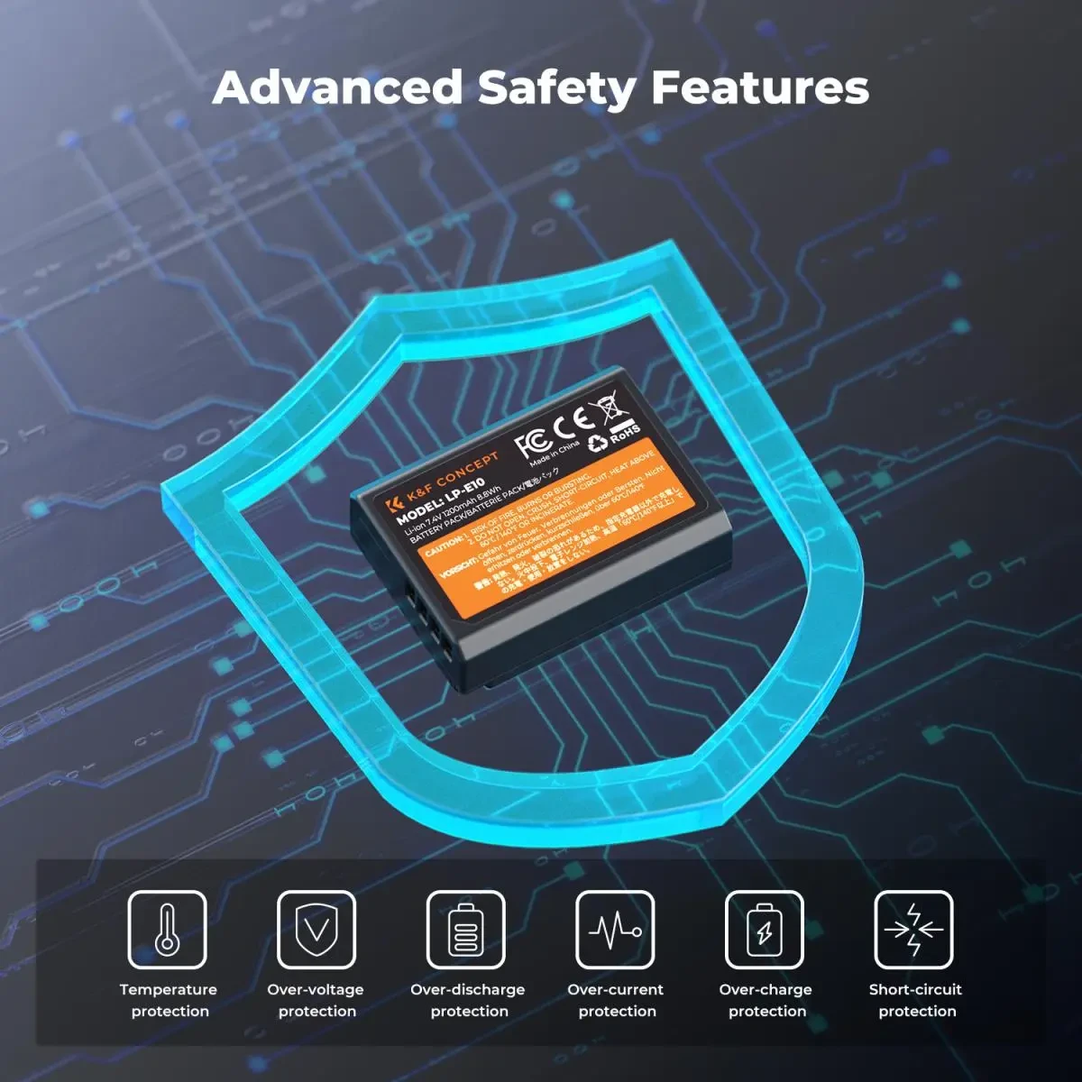 - * 【Múltiples protecciones de seguridad】Certificaciones CE/FCC/RoHS/3C, múltiples protecciones integradas (sobretensión, sobrecorriente, cortocircuito, alta temperatura, sobrecarga). El paquete incluye 3 baterías LPE10, 1 cargador de baterías LPE10 con 3 ranuras y 1 cable de carga USB-C.