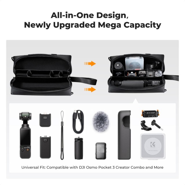 Funda K&F para DJI Osmo Pocket 3. Protege tu equipo con estilo con la funda oficial para DJI Osmo Pocket 3. Esta elegante funda, diseñada específicamente para el Creator Combo, ofrece un espacio de almacenamiento seguro para tu cámara y los accesorios imprescindibles.