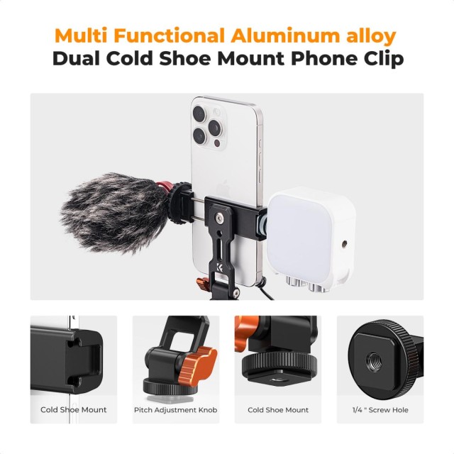 El soporte para teléfono con trípode cuenta con dos puertos para conectar micrófonos, luces de relleno y otros accesorios. Además, los puertos de la base de montaje se pueden girar para ajustar el ángulo de los accesorios. Este soporte para teléfono móvil permite una inclinación de hasta 180° y un ajuste de 360° en todas las direcciones, lo que le permite…