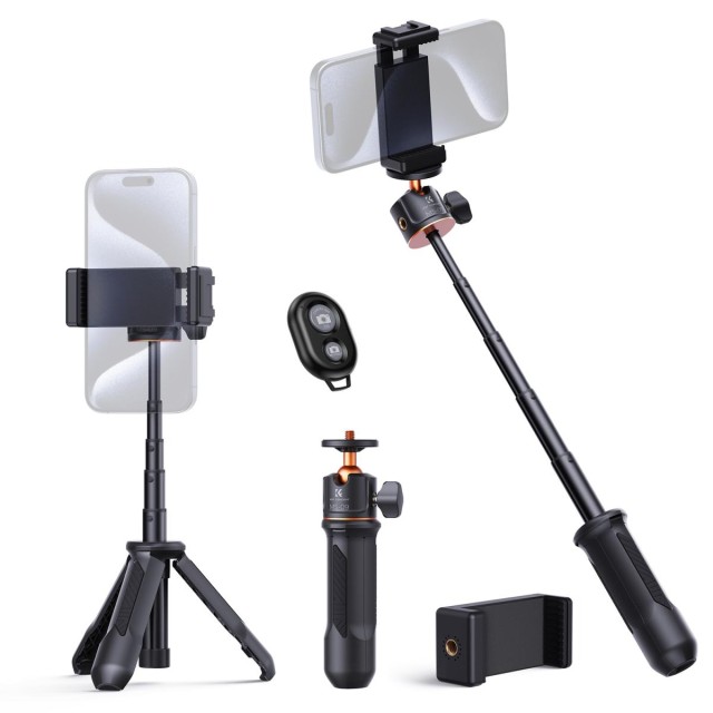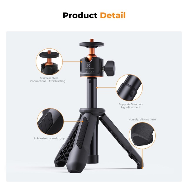 Trípode para teléfonos móviles MS02 / Trípode de 34 cm para teléfonos móviles con mando a distancia, en negro y naranja. Alcanza una altura máxima de 34 cm y cuenta con un ajuste de patas de 5 posiciones, lo que te permite ajustar la altura deseada a tu gusto. El cabezal del trípode soporta una carga de hasta 2 kg y es adecuado para la mayoría de cámaras sin espejo, trípodes para teléfonos móviles con mando a distancia y otros dispositivos.