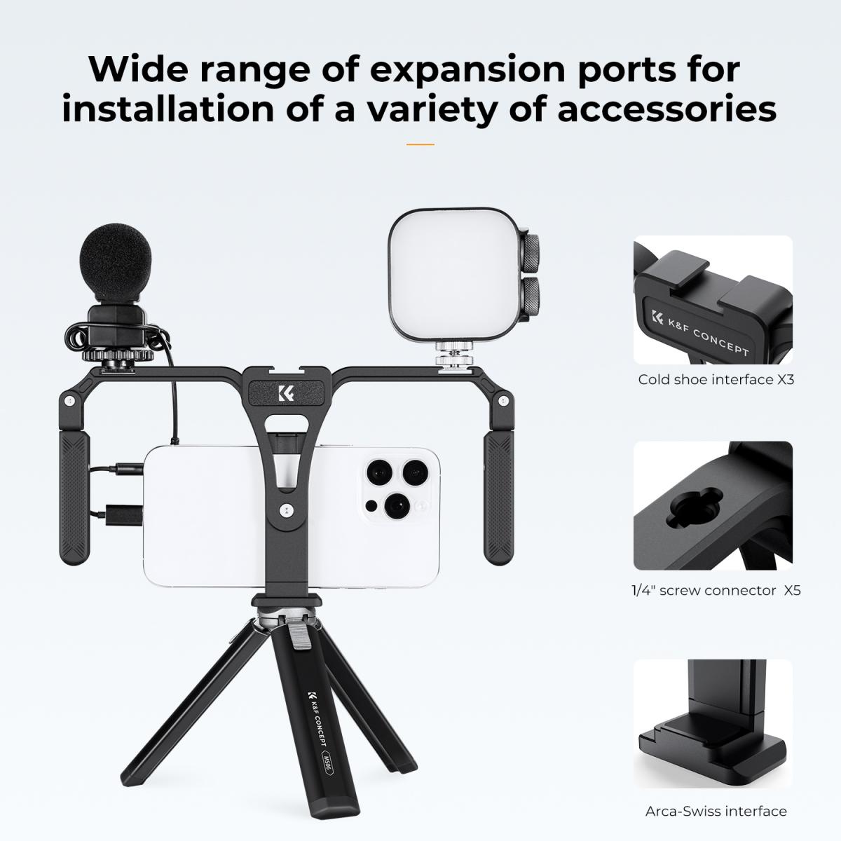 • * La jaula para conejos está equipada con 3 interfaces de zapata fría y 5 interfaces roscadas de 1/4 de pulgada, lo que permite instalar y utilizar fácilmente luces de relleno, micrófonos u otros accesorios para mejorar la calidad y el efecto de la grabación de vídeo. También cuenta con una interfaz estándar Arca-Swiss y se puede acoplar a un trípode.