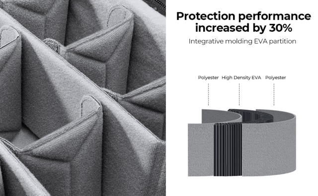 - Espacio amplio y flexible para al menos 2 cámaras y 4 objetivos adicionales, un trípode, un dron, un portátil de 15,6" y otros accesorios.