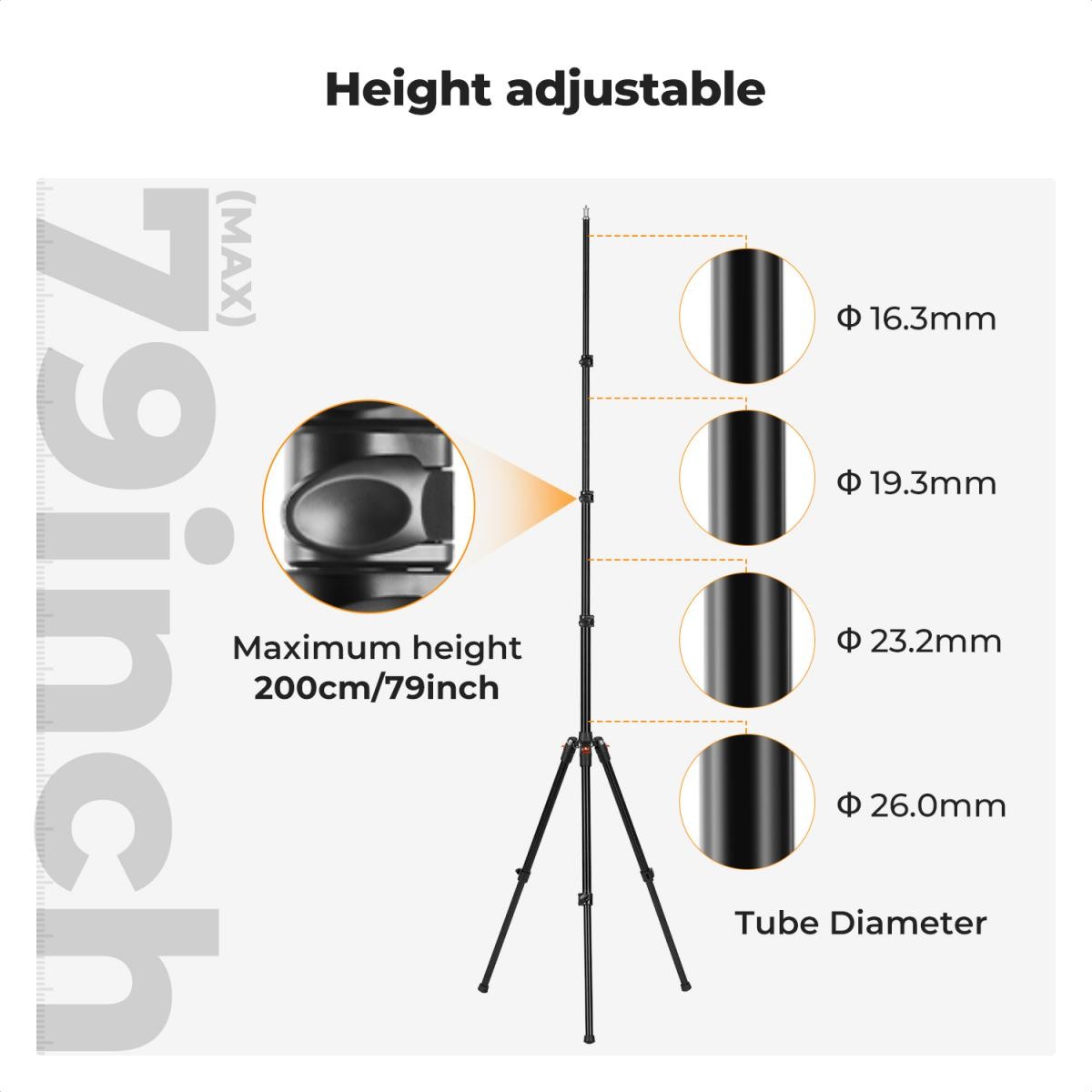 El tornillo superior de 1/4" es compatible con flashes, luces de panel, luces circulares, barras de luz, softboxes, paraguas, proyectores, cámaras y teléfonos inteligentes (con soporte para teléfono).