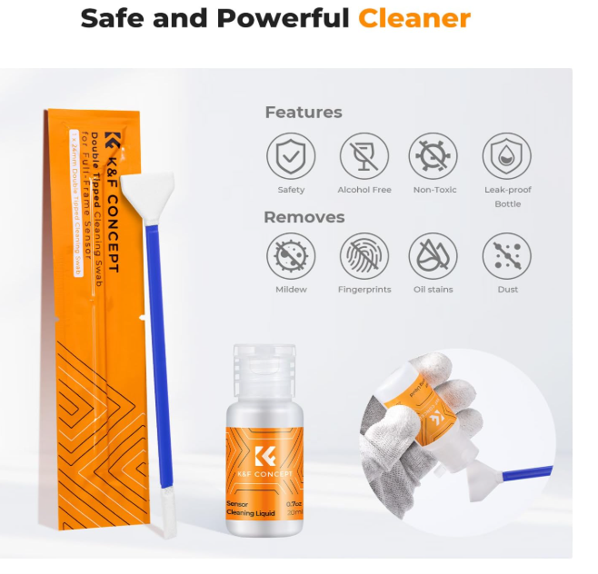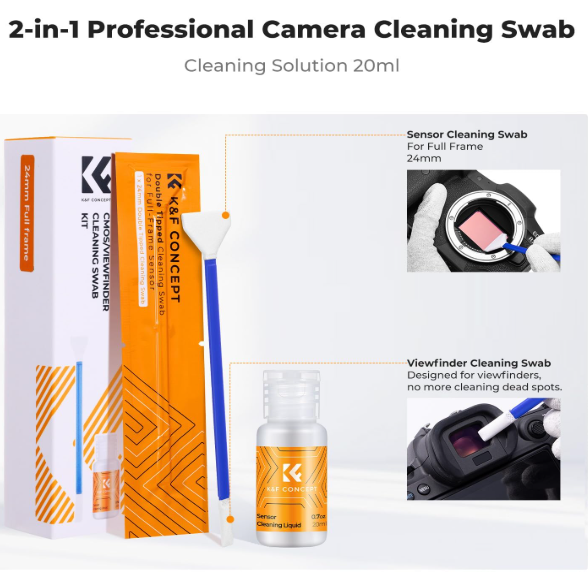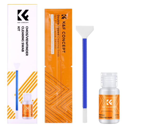El kit de limpieza K&F Concept Full Frame Cleaning Kit es una solución 2 en 1 para sensores CMOS/CCD de fotograma completo de 24 mm y visores, que incluye 5 almohadillas de microfibra con doble función, 20 ml de solución limpiadora que no deja marcas y un envase sellado al vacío para un uso libre de polvo. Es ideal para cámaras sin espejo y DSLR, y garantiza una limpieza segura y precisa de objetivos, pantallas y ópticas sin arañazos ni residuos.