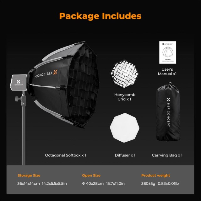 El softbox octogonal K&F de 40 cm con mini montura Bowens es el accesorio ideal para fotógrafos y camarógrafos que desean conseguir excelentes resultados de iluminación.