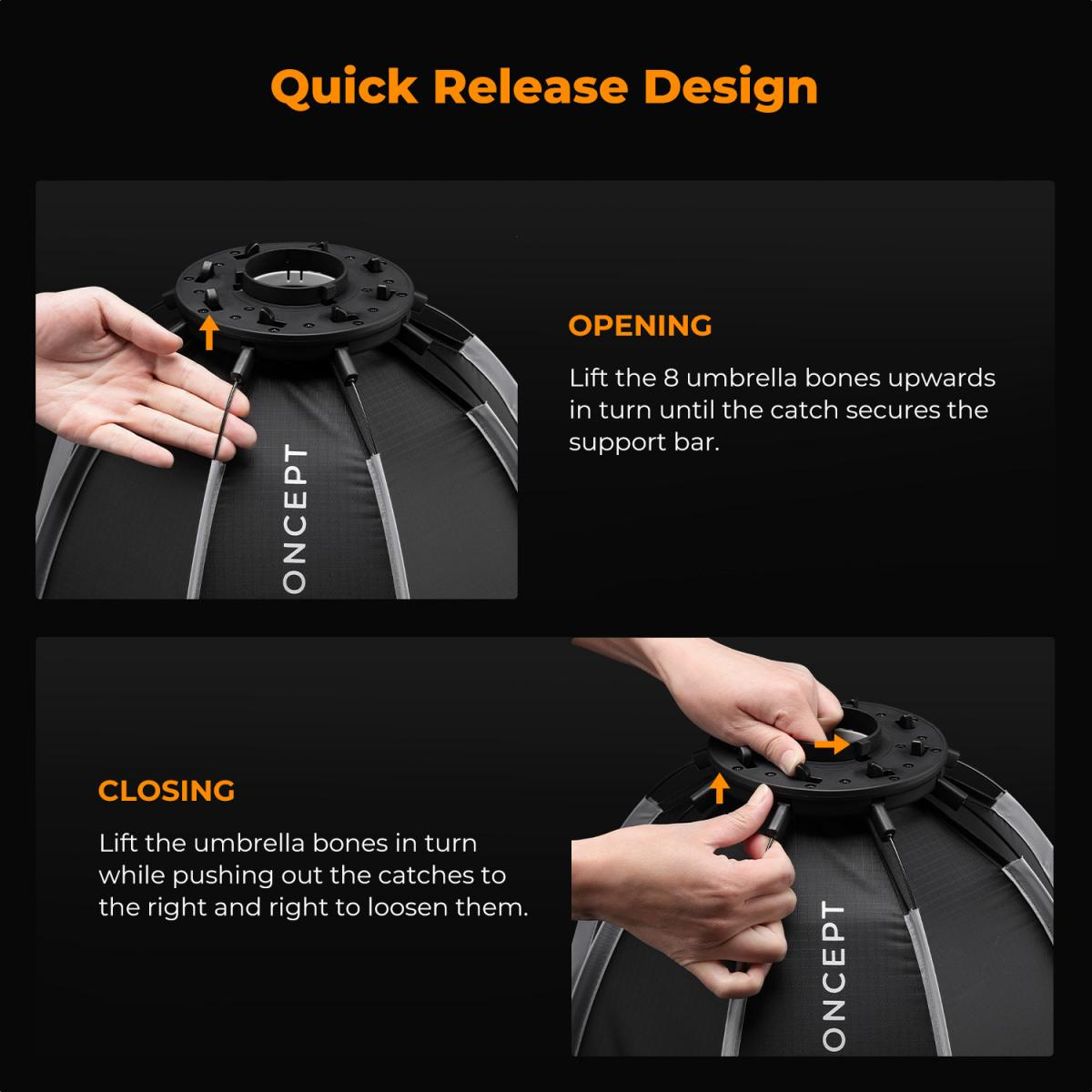 El diseño integrado de las varillas del softbox y el soporte no requiere ningún montaje. Basta con sacar las 8 varillas y en unos segundos estará listo. Para desmontarlo, levante cada varilla y presione el soporte hacia la derecha para liberarlo rápidamente.