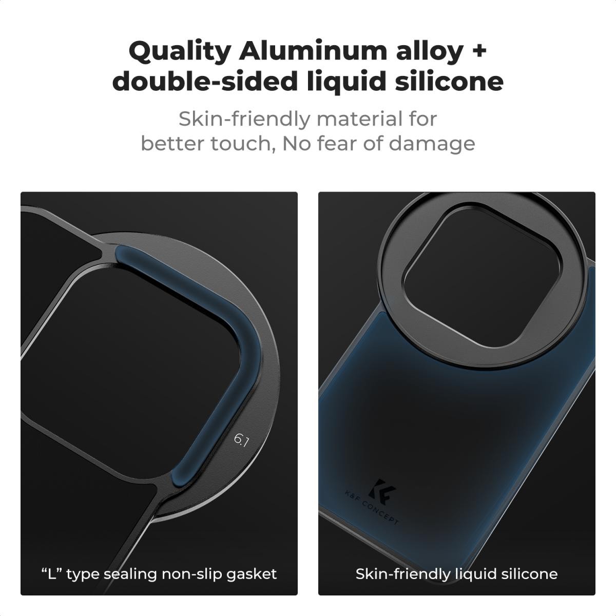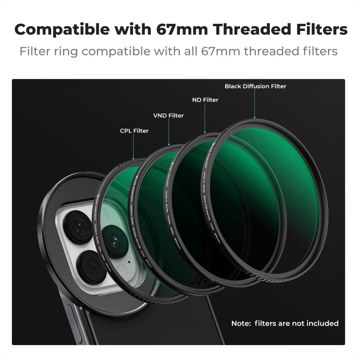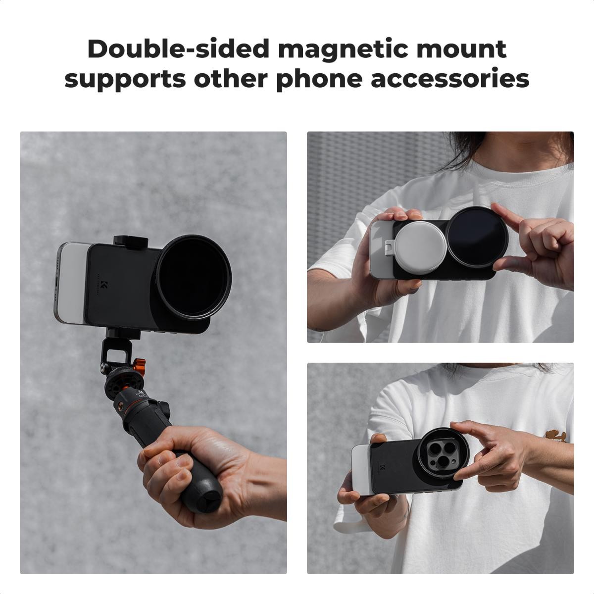 El adaptador para el soporte magnético de filtros K&F Concept de 6,1 pulgadas supone una revolución en la fotografía con iPhone, ya que se acopla magnéticamente a modelos como el iPhone 16/16 Pro, 15/15 Pro, 14/14 Pro, 13/13 Pro y 12/12 Pro, y permite utilizar sin problemas filtros con rosca de 67 mm (CPL, ND, UV, Black Diffusion, estrella, etc.—no incluidos en el paquete) sin limitar el campo de visión ni la compatibilidad de los filtros magnéticos. Su diseño magnético extensible a ambos lados permite apilar accesorios, como anillos de luz u otros soportes, en ambos lados para una configuración versátil, mientras que el asa antideslizante en forma de L, los bordes con sellado liso contra fugas de luz y el revestimiento de silicona suave garantizan un manejo sin huellas dactilares y una estabilidad firme en la fotografía diaria.