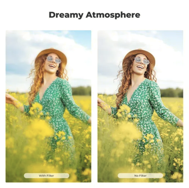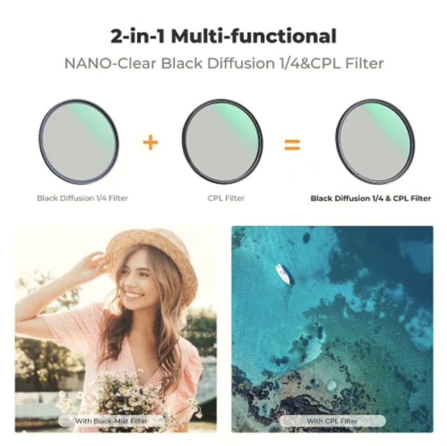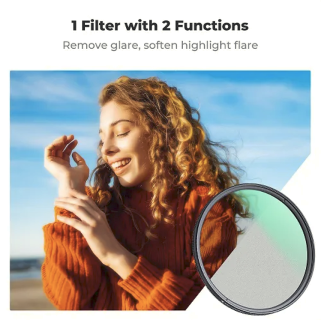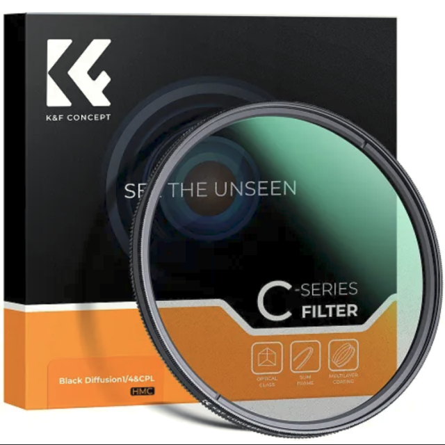 El filtro K&F Concept 72 mm 2 en 1 Black Mist 1/4 + CPL combina el efecto difuminado propio del cine con un control preciso de la polarización, y ofrece tonos claros suavizados, sombras realzadas, reflejos reducidos y colores mejorados, todo ello en un diseño fino y resistente con un revestimiento multicapa, ideal para retratos, paisajes y vídeos profesionales.