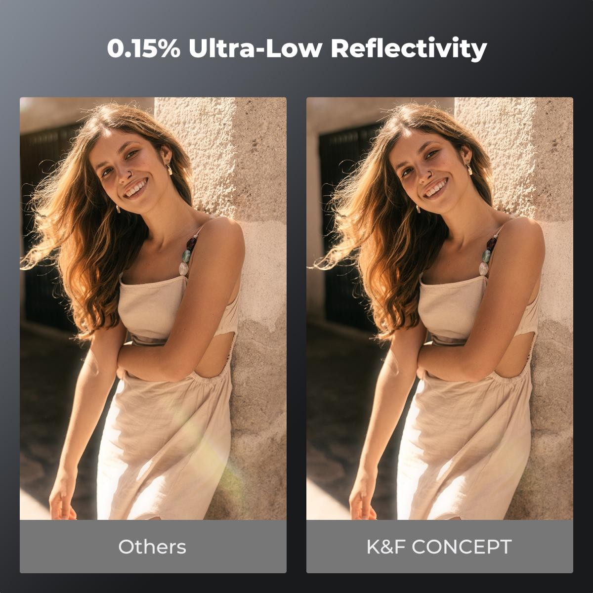 El filtro K&F CONCEPT 72 mm Nano-X Pro Black Mist 1/4 estádiseñado para fotógrafos y cineastas que buscan imágenes con calidad cinematográfica. Gracias a su tratamiento superficial con una reflectividad extremadamente baja de tan solo el 0,15 %, minimiza los reflejos de las fuentes de luz brillantes y garantiza imágenes nítidas y de aspecto natural con un suave efecto difuminado. El filtro suaviza las imperfecciones de la piel y crea una atmósfera onírica sin pérdida de detalles, lo que lo hace ideal para retratos y fotografía nocturna. Está fabricado con un marco trapezoidal de latón mecanizado con precisión mediante CNC, que ofrece resistencia, una fijación suave y resistencia a los golpes. La capa nano de 36 capas protege contra el agua, el aceite, los arañazos y el moho, mientras que el cristal óptico japonés de primera calidad AGC garantiza una excelente claridad y transmisión de la luz. El filtro se suministra con un lujoso estuche de ante para su almacenamiento y transporte seguros, que combina protección con elegancia profesional.