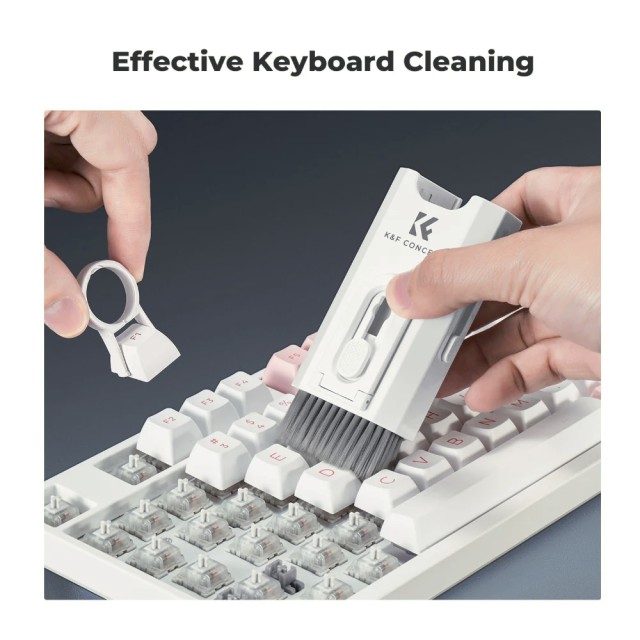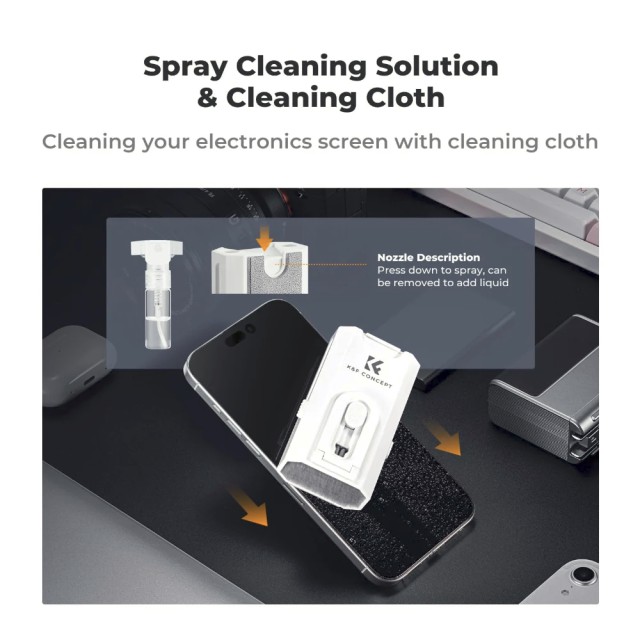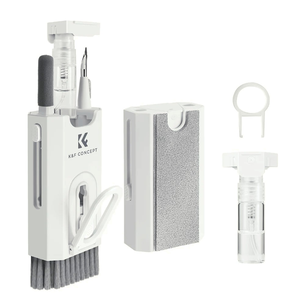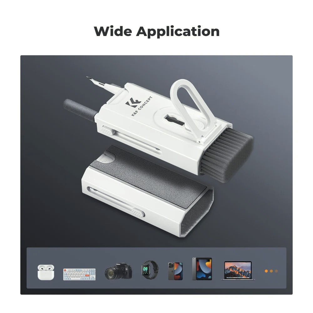 Mantén tus dispositivos impecables gracias al kit de limpieza 8 en 1 de K&F Concept. Este kit multifuncional y portátil incluye todas las herramientas necesarias para limpiar de forma segura y eficaz teclados, smartphones, ordenadores, auriculares y otros dispositivos.