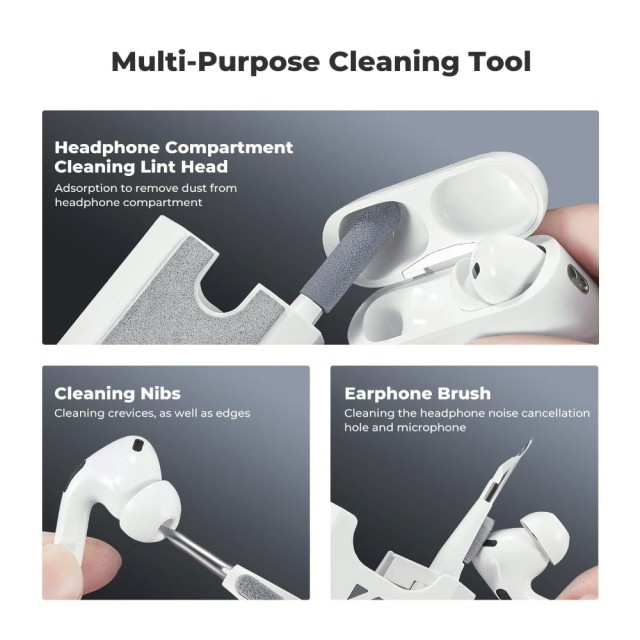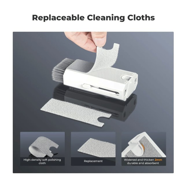 El kit incluye un cepillo retráctil de fibras suaves de alta densidad, capaz de eliminar el polvo y la suciedad de teclados, dispositivos móviles y otras superficies delicadas sin rayarlas ni dejar fibras. El kit también incluye paños de microfibra para una limpieza precisa de pantallas y superficies, una herramienta para retirar con seguridad las teclas del teclado y un soporte para el teléfono móvil que proporciona un apoyo cómodo durante la limpieza.