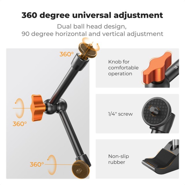El brazo articulado K&F Concept de 9,8" con pinza se puede utilizar con diversos accesorios fotográficos. Tanto si fotografías desde las alturas como desde un ángulo bajo, este brazo te permitirá descubrir nuevos ángulos de toma.