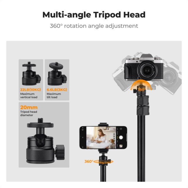 La rótula de 360° totalmente ajustable, con un rango de inclinación de -90° a +90°, te ofrece total libertad a la hora de colocar tu equipo en vertical u horizontal. Gracias a la fijación con tornillo de 1/4″, la rótula de 1/4″ incluida y el adaptador de 1/4″ a 3/8″, este trípode es adecuado para una amplia gama de dispositivos, incluyendo luces LED, soportes para teléfonos, cámaras web, cámaras sin espejo y luces circulares, lo que lo convierte en una herramienta versátil e indispensable para creadores de contenido, streamers, fotógrafos y videógrafos.