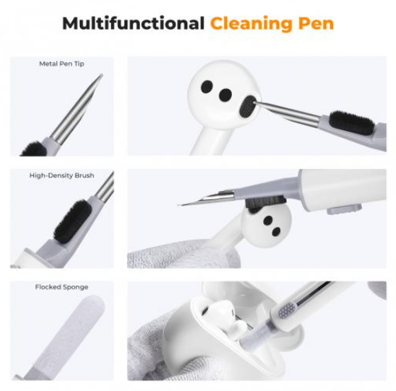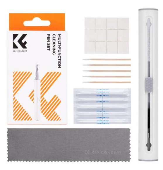 El kit K&F Concept Airpod Cleaner Kit es un lápiz limpiador multifuncional 3 en 1 con un cepillo suave, una esponja flocada, un bastoncillo de algodón con memoria, cinta adhesiva, un hisopo con alcohol y un paño de microfibra, diseñado para el mantenimiento a fondo de los auriculares Bluetooth. Elimina la grasa, el polvo, las manchas y las bacterias de las superficies, las salidas de sonido y los compartimentos, y restaura la higiene y el brillo de los AirPods o dispositivos similares.