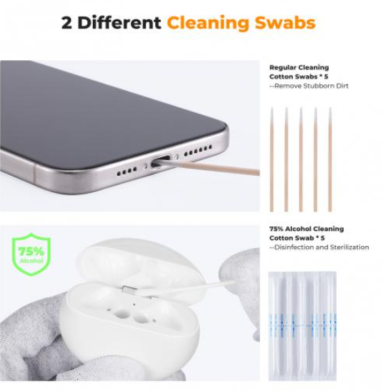 • Lápiz limpiador 3 en 1: cepillo suave para superficies externas, esponja flocada para superficies, bastoncillo de algodón con memoria para compartimentos