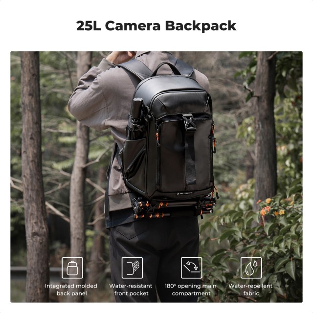 La mochila K&F Concept KF13.211 de 25 litros ofrece un equilibrio inteligente entre capacidad y portabilidad, lo que la hace ideal para los fotógrafos que viajan con frecuencia. Su diseño con solapa trasera permite un acceso total, perfecto para organizar el equipo, mientras que el panel lateral permite sacar rápidamente la cámara sin necesidad de quitarse la mochila. Los separadores de espuma ajustables protegen las cámaras réflex digitales o sin espejo, los objetivos de repuesto y los accesorios, mientras que el compartimento acolchado protege el portátil o la tableta.