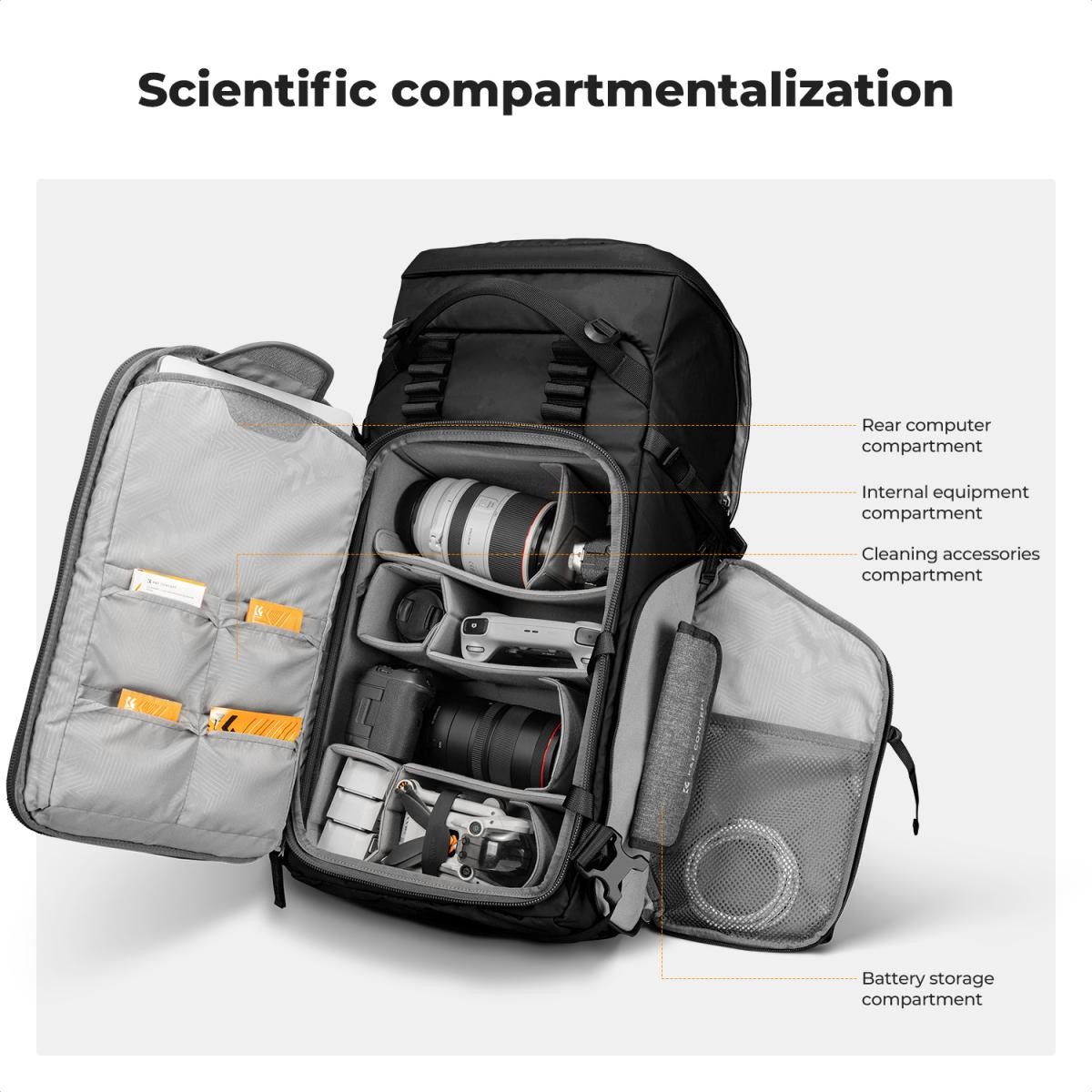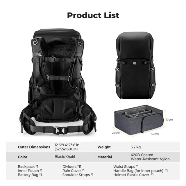 La mochila para cámara K&F CONCEPT Star Wander05 40L (negra) ofrece a fotógrafos y viajeros un espacio de almacenamiento versátil y de gran capacidad. Está diseñada para albergar 2 cámaras, 6 objetivos y accesorios. Cuenta con compartimentos personalizables, acceso lateral rápido, correas ergonómicas y nailon 420D resistente e impermeable,…