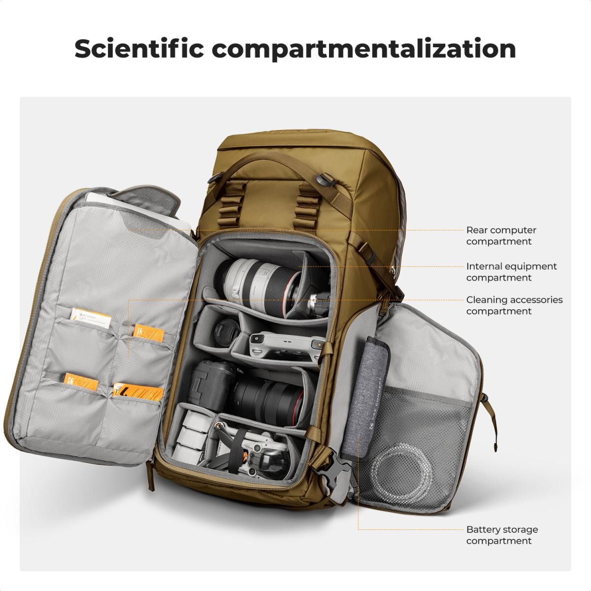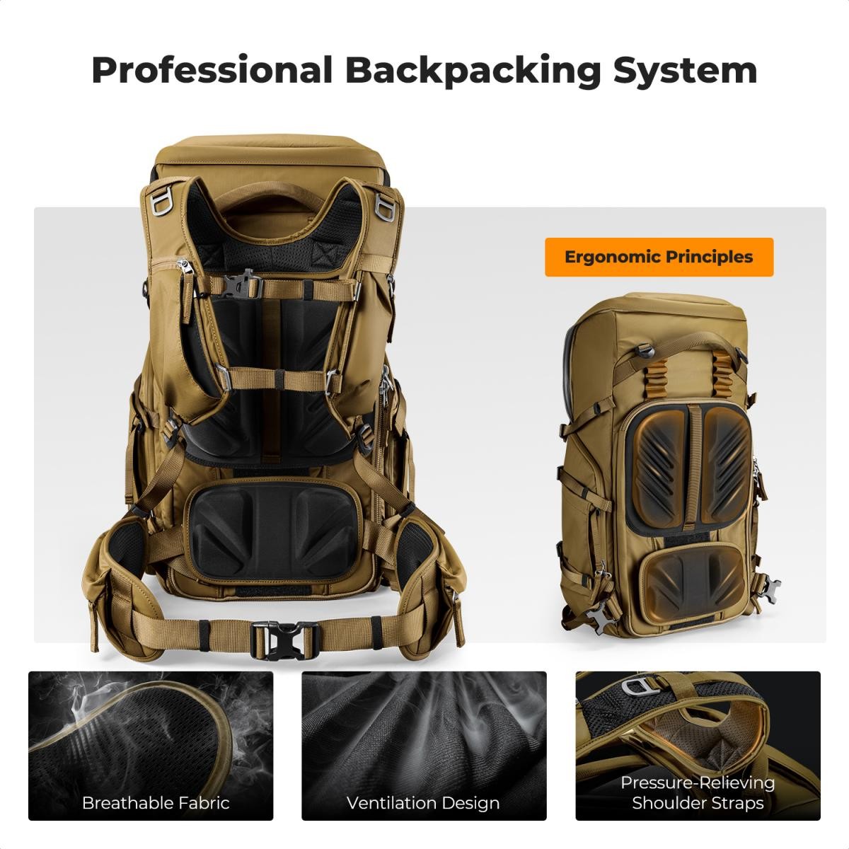 La mochila K&F CONCEPT Backpack 40L Star Wander05 (Champagne) es una mochila profesional para fotografía al aire libre y senderismo diseñada para ofrecer comodidad, protección y un acceso rápido. Gracias a su sistema ergonómico de correas con triple ajuste, a los materiales resistentes a la intemperie y al forro modular extraíble para la cámara, esta mochila es ideal para fotógrafos y aventureros que transportan equipo pesado a largas distancias.