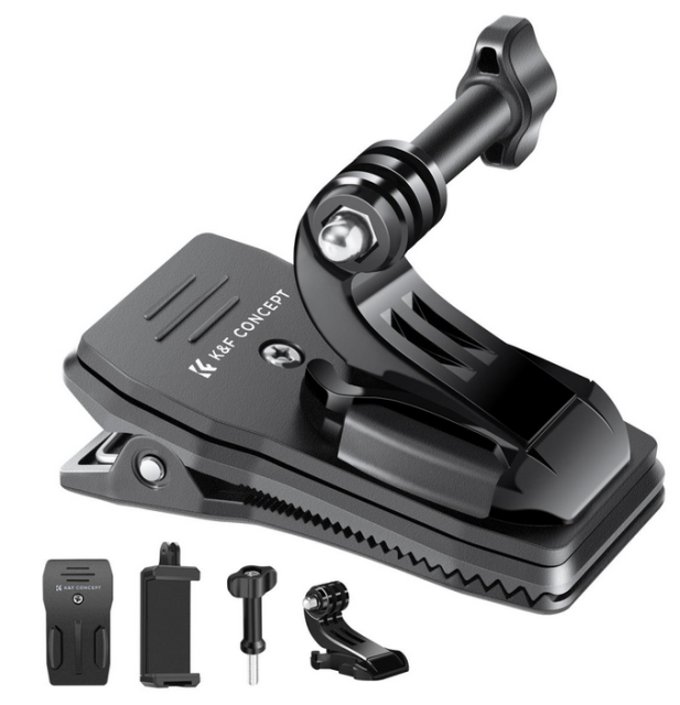 Disfruta de una gran versatilidad con el soporte manos libres K&F Concept Backpack Strap Clip Mount, diseñado para una fijación segura, un giro de 360° y compatible con una amplia gama de cámaras de acción y teléfonos inteligentes.