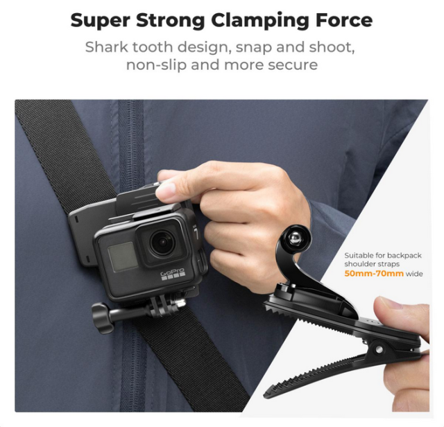 El clip se instala rápidamente y es fácil de usar; gracias a su abertura de 4 cm y a su compatibilidad con correas de 5-7 cm de ancho, se fija firmemente a la mayoría de las correas habituales de mochilas, gorras y otros puntos de montaje. Es compatible con una amplia gama de dispositivos, incluidos los modelos GoPro Hero, DJI Osmo Action, cámaras Insta360 y teléfonos inteligentes de 65-102 mm de ancho.