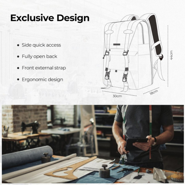 - Gran capacidad: 30 × 17 × 44 cm, aproximadamente 20 l. El compartimento superior sirve para guardar diversos objetos personales, como ropa, la cartera, el teléfono móvil o un flash; también dispone de un compartimento para un portátil de hasta 15,6 pulgadas. En el compartimento inferior se puede guardar 1 cámara + 4 objetivos y otros accesorios, como filtros, baterías o tarjetas de memoria, o incluso un dron DJI.