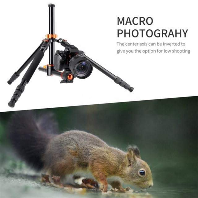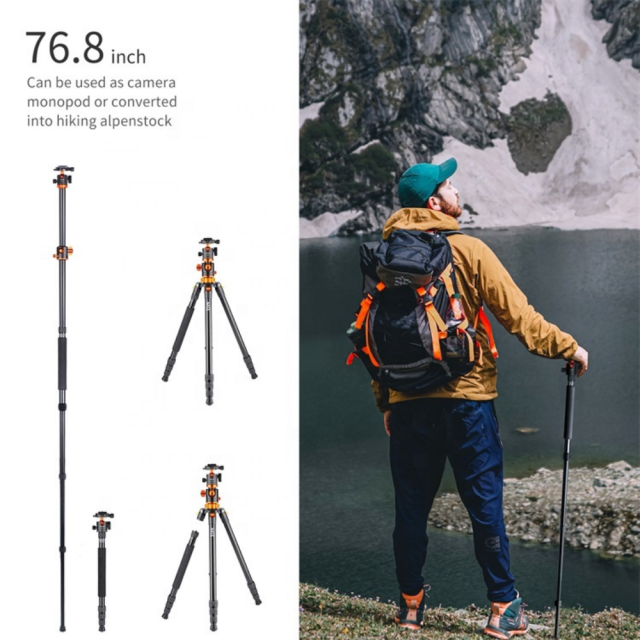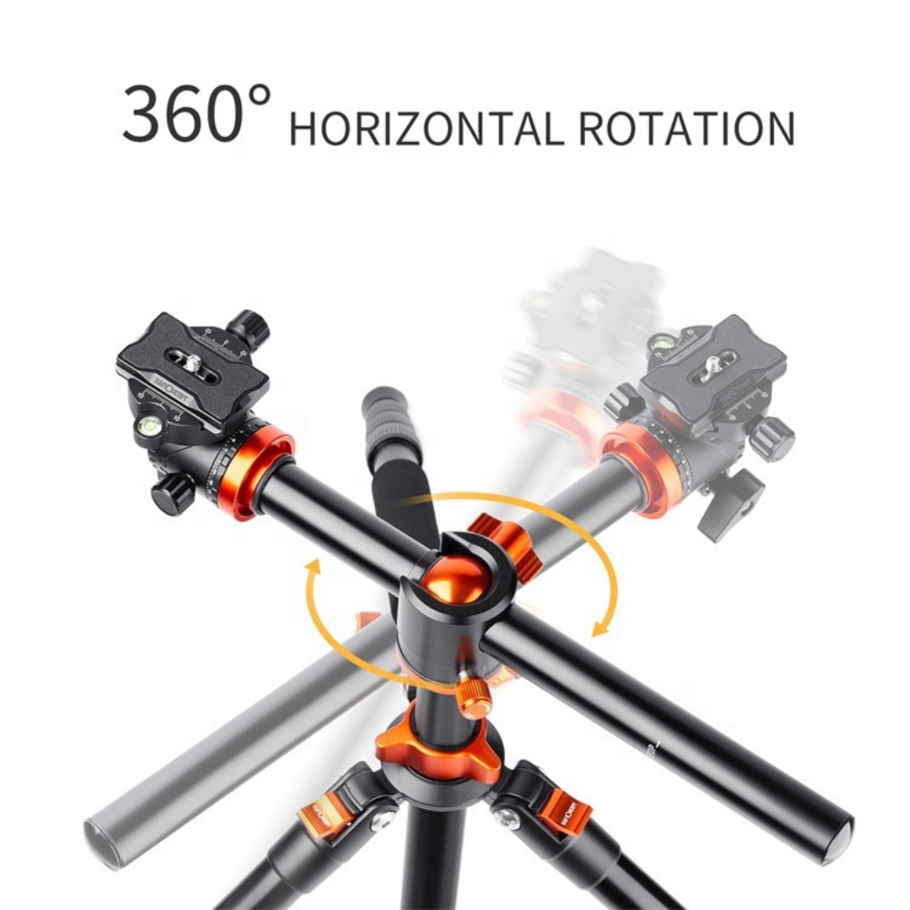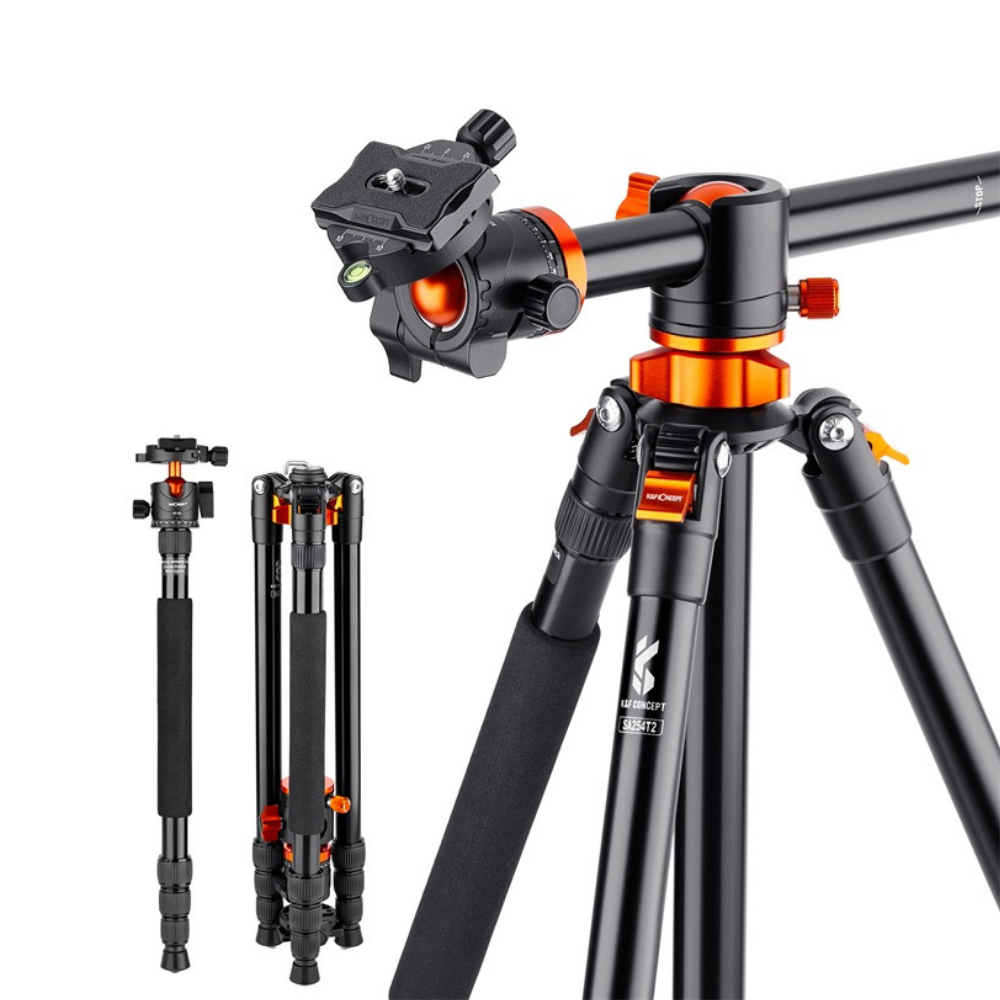 El kit de trípode de aluminio K&F Concept 09.090 ofrece un diseño ligero y compacto con una capacidad de carga de hasta 10 kg y patas con ajuste independiente para trabajar con seguridad incluso en terrenos difíciles. Las patas cuentan con grandes cierres de hebilla para una configuración muy rápida del conjunto de cámara/DSLM; por supuesto, también es posible colocar el trípode a una altura baja (56 cm) y plegarlo hasta una longitud de 48 cm, lo que facilita su transporte. ¡La pata desmontable permite utilizar el trípode también en modo monopié en combinación con la columna central hasta una longitud máxima de 195 cm! El kit incluye también una rótula de 28 mm con posibilidad de bloqueo en modo panorámico y una escala de fácil lectura.