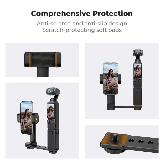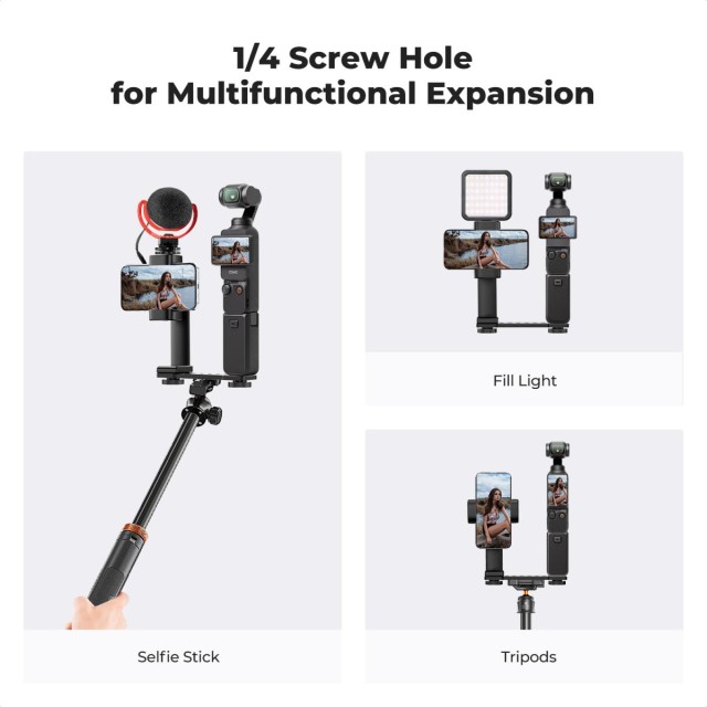 Mejora tus grabaciones con la DJI Osmo Pocket 3 gracias al soporte para móvil de K&F Concept, diseñado para acoplarse fácilmente a tu smartphone y ofrecerte una pantalla más grande y un control más preciso de la cámara. La base de conexión está fabricada en aleación de aluminio anodizado mecanizado con CNC, mientras que la abrazadera para el teléfono está fabricada en plástico PC+ABS de alta calidad y acero inoxidable, lo que garantiza una conexión segura y estable. Su diseño universal permite un giro horizontal y vertical de 360°, junto con un ajuste de inclinación de 180°, para que puedas capturar imágenes desde prácticamente cualquier ángulo. Sus amplias opciones de expansión incluyen seis puertos adicionales de 1/4" en la base, lo que suma un total de ocho, además de una placa de montaje y un puerto de 1/4" en la propia abrazadera del teléfono. Conecta fácilmente trípodes, palos selfies, micrófonos o luces adicionales y mejora así tu experiencia de grabación. Ideal para creadores que necesitan flexibilidad, estabilidad y opciones de ajuste profesionales en un único accesorio compacto.